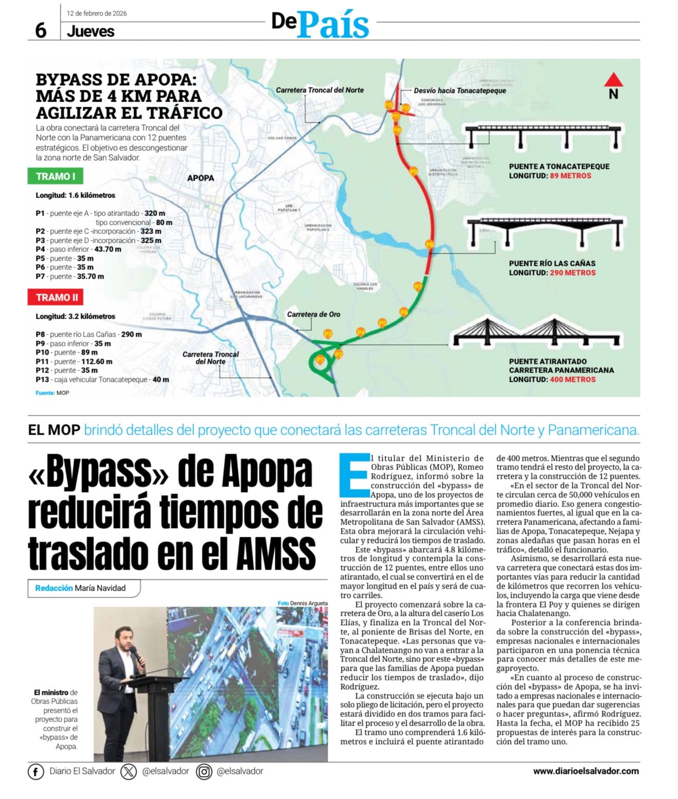 ¡Prepárense para una transformación vial histórica! El Gobierno del presidente Nayib Bukele, a través del Ministerio de Obras Públicas, ha anunciado oficialmente la construcción del megaproyecto del bypass de Apopa, una obra que enterrará para siempre los interminables tacos de la Troncal del Norte. 🏗️💥 Esta carretera de 4.8 kilómetros totalmente nueva contará con 12 puentes de ensueño, incluyendo un imponente puente atirantado que será el más largo del país. El trazado iniciará sobre la carretera de Oro, a la altura del caserío Los Elías, y culminará en Brisas del Norte, a pocos metros del desvío a Tonacatepeque, conectando finalmente la Troncal del Norte con la Panamericana.